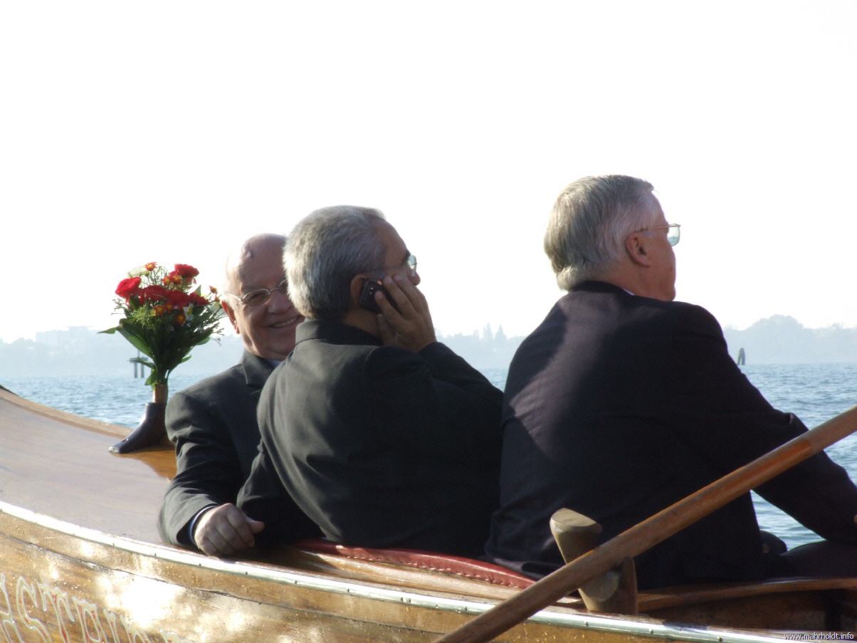 Und trotzdem: Da kommen Direktoren, Chefredakteure und Intendanten aus der ganzen Welt zusammen, um sich auf Einladung eines der vormals mächtigsten Politiker dieser Welt über deren Zukunft zu unterhalten... Vielsprachig... Mein Deutsch, Englisch, Französisch und Italienisch gebrauche ich gleichermaßen, es tut richtig gut, ich liebe solches Babylon. Nur als ich neben Karen Karagesian, seit vielen Jahren quasi die rechte Hand Gorbatschows, in einer Gondel sitzend mich auf die Klosterinsel San Servolo zum Abschluß der Tagung transportieren lasse, muß ich mich neidlos verneigen: Meine vier Sprachen beherrscht der mit links, bei ihm kommen noch die ganzen slawischen hinzu... Wie auch immer: Der spachlichen Geschicklichkeit entspricht auch eine lebensweltliche, um nicht zu sagen - geschäftliche. In Venedig treffen Idealismus, Tagungs-Routine, NGO-Professionalität und Prominenz zusammen. Viele bunte Teilnehmer an einem großen Spiel. Aber das war ja immer schon so in Venedig: In der Serenissima ist allein schon die Geste bedeutungstragend...